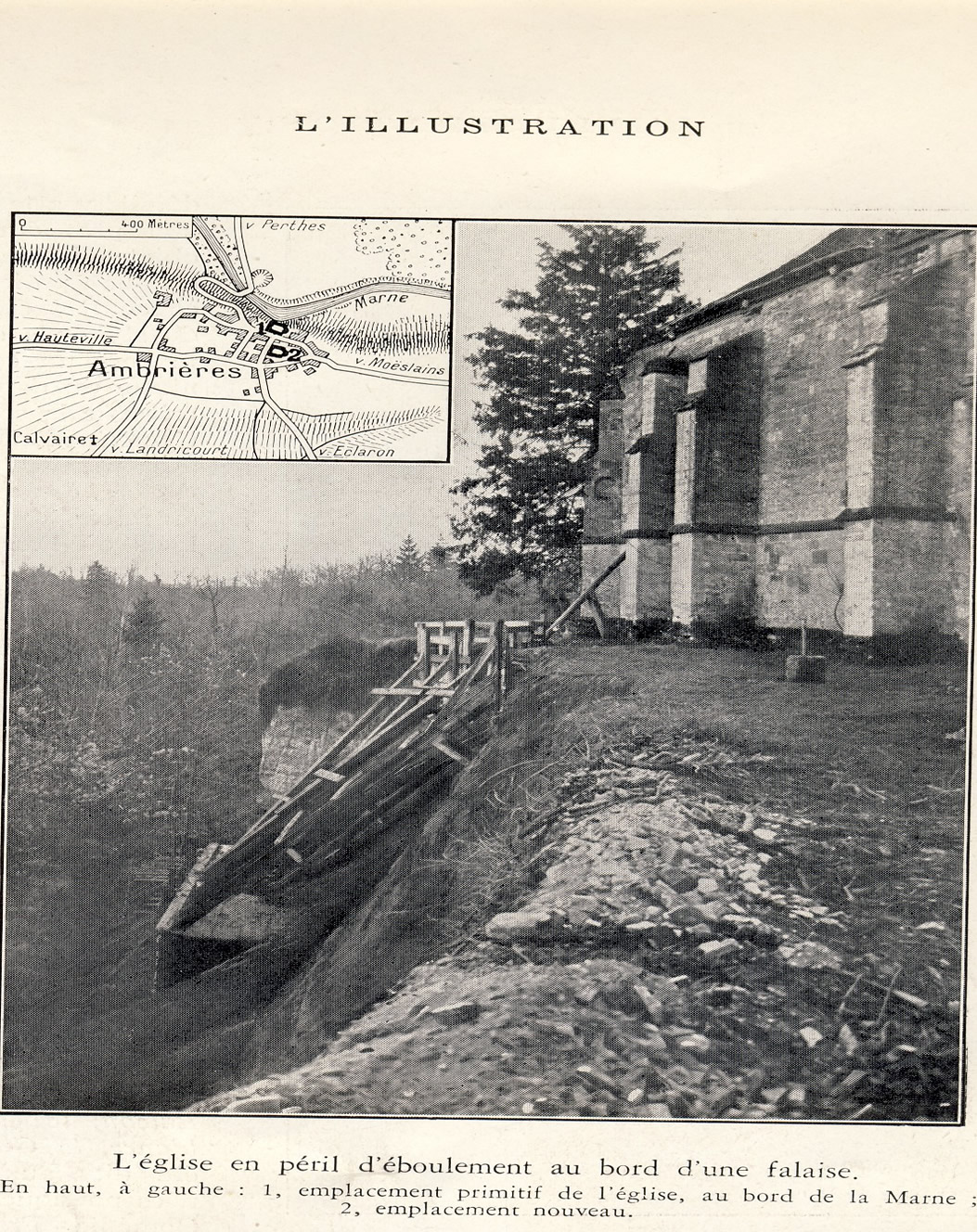 Classée monument historique en 1918, l’église fut démontée pierre par pierre, les blocs repérés, puis transportés par un petit chemin de fer et reconstruits à l’identique, 300 mètres plus loin. Ce chantier inédit en France débuta en 1926 et s’acheva par l’inauguration en 1935, après la pose de la première pierre par Monseigneur Tissier le 21 mai 1928.